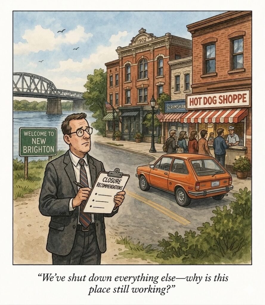 New Brighton continues the unglamorous work of being a town. Roads carry traffic through its streets. Schools educate the next generation. Borough officials meet, budgets are balanced, and life moves forward in the steady, practical way it always has.