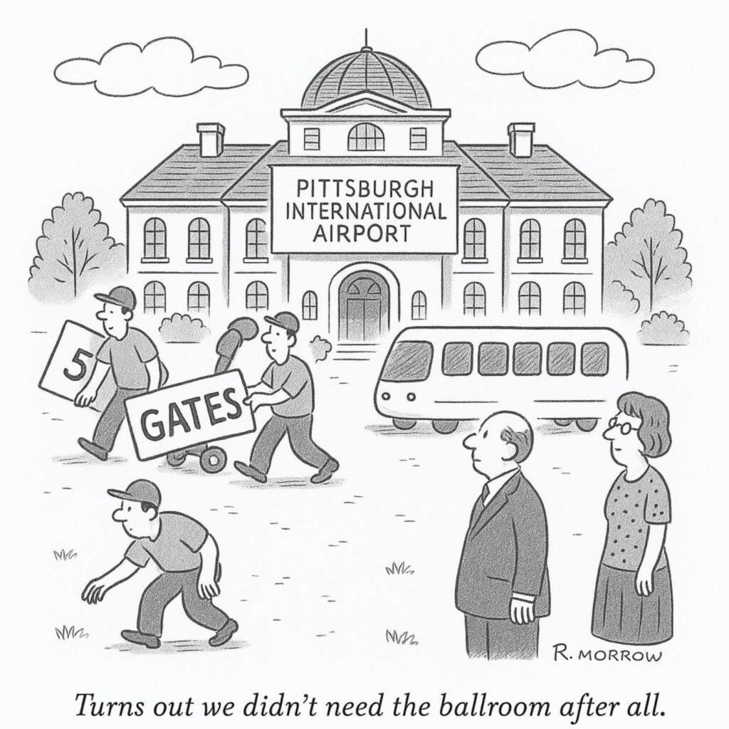 These days, the house is being remodelled to fit its occupants. The new owners have ripped out the extra parlors, knocked down a few walls, and installed windows that actually let in light. The “right-sizing” project at PIT—now estimated at $1.7 billion—was originally budgeted closer to $1.39 billion. And while headlines once suggested a 2023 opening, the true baseline was always January 2025. That date has since been nudged to Fall 2025, because in Pittsburgh we treat timetables the way we treat pothole …